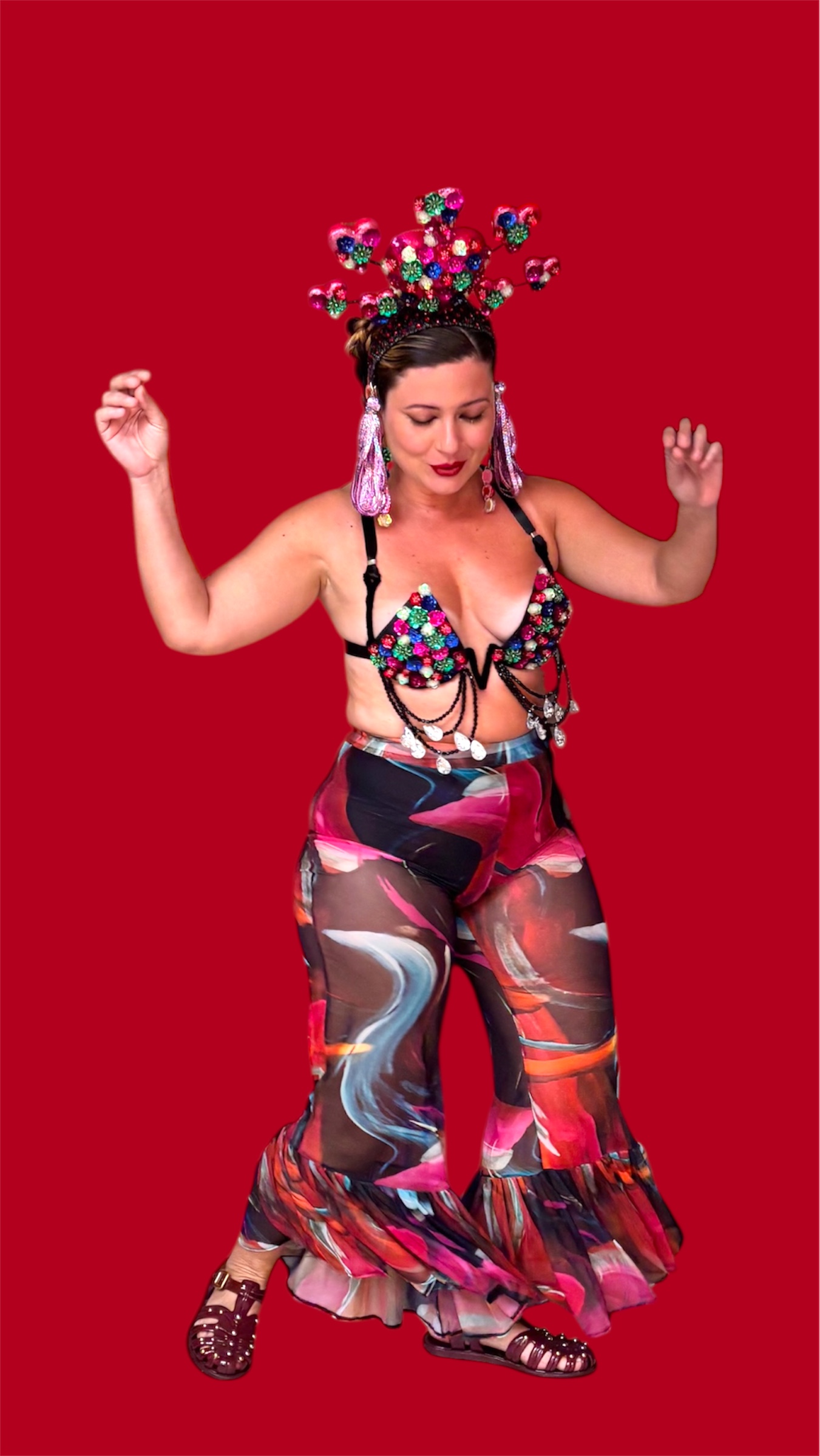 Em tule, a peça super levinha. A bossa está na estampa e nos babados das suas barras.