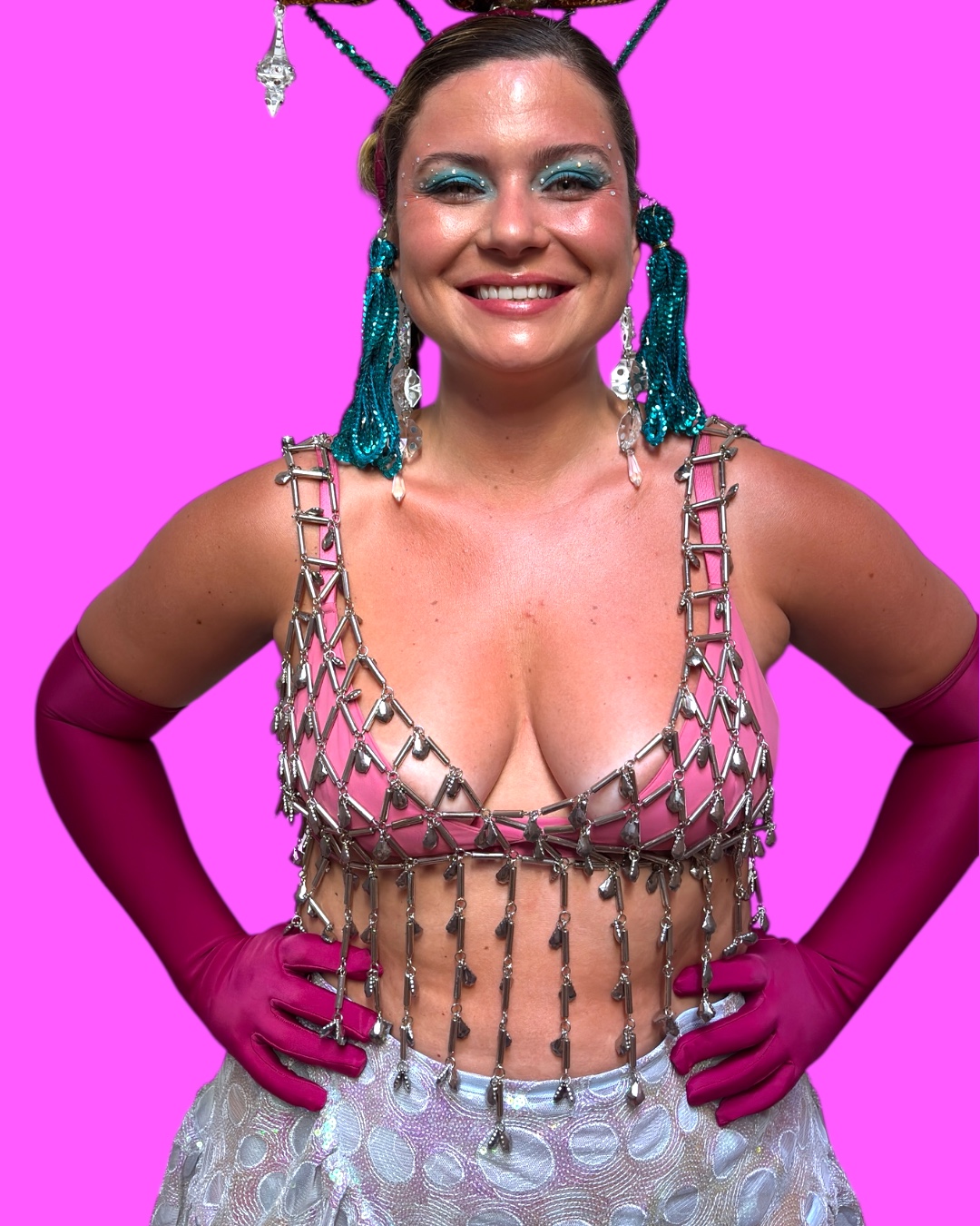 Top em miçangas e penduricalhos prateados. Super versátil! Tamanho P/M
