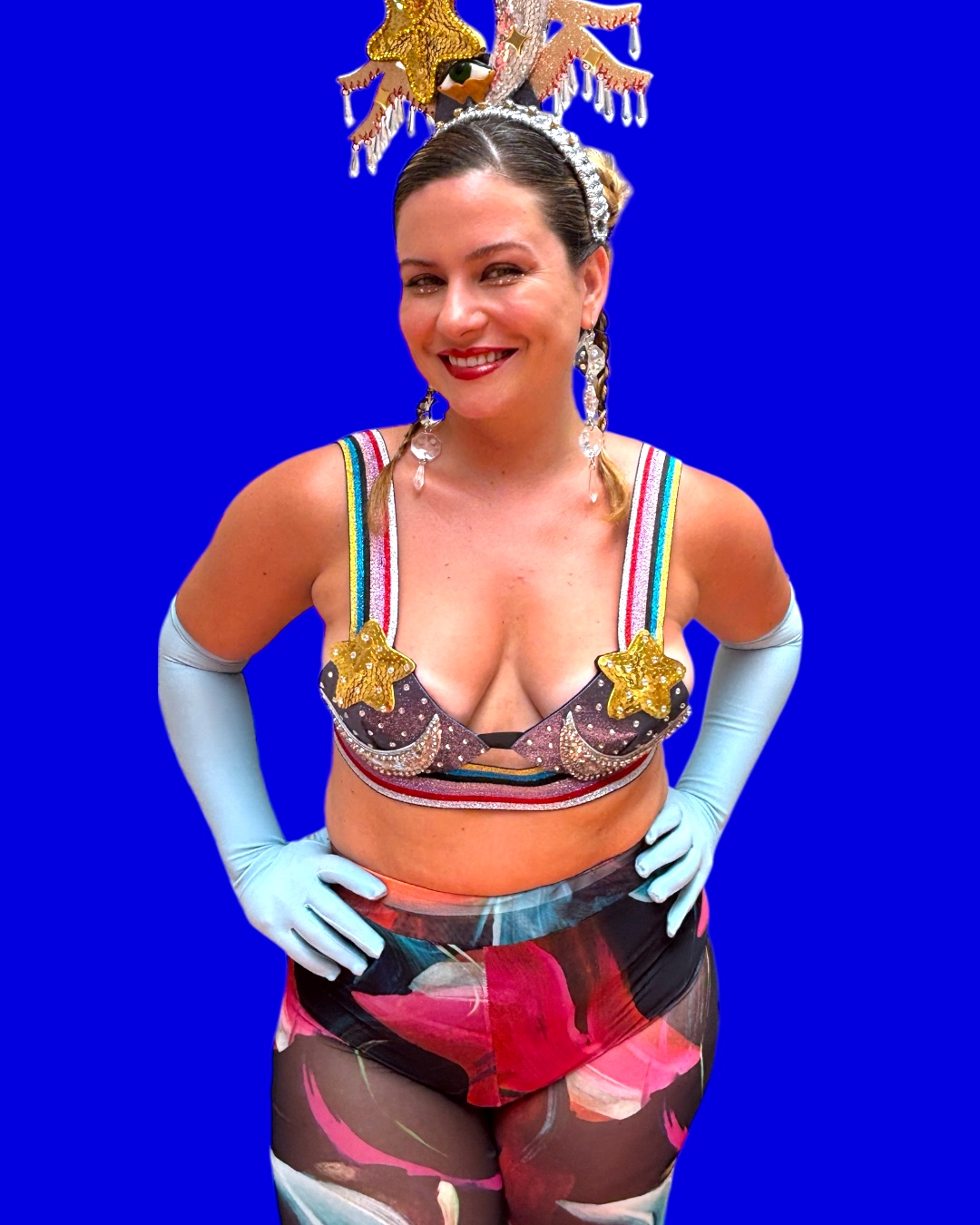 Feito em EVA, coberto de paetês e strass, com forro em feltro para maior conforto.