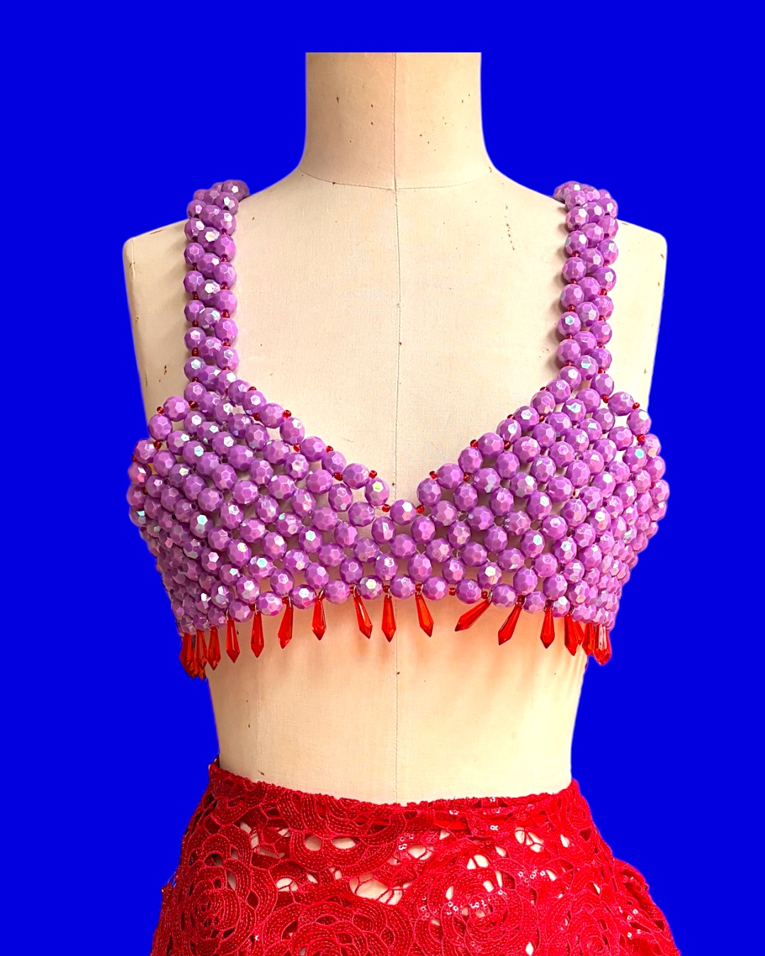 Top todo em miçangas liláses, com penduricalhos. Fechamento por elástico nas costas. Tamanho P/M