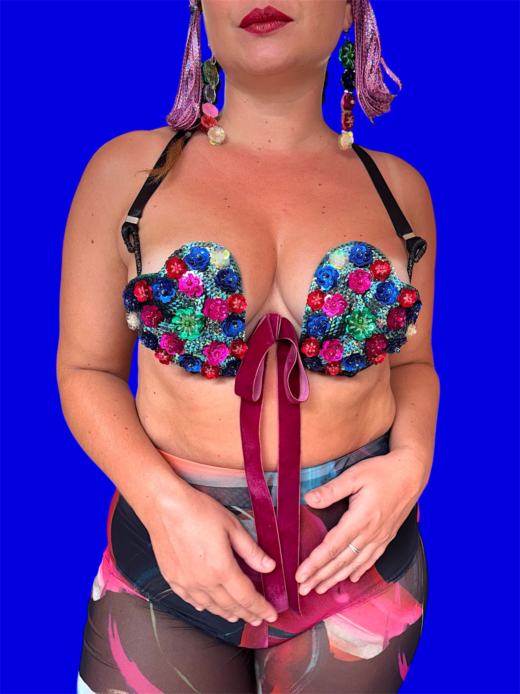 Com armação de arame forrado, fechamento regulável por amarração de elástico nas costas. Por ser flexível, pode ser ajustado para diferentes tamanhos, servindo em bustos entre 40 e 46.